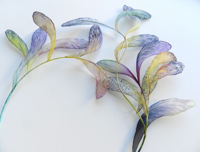 モチーフの内部は空間になっており、2枚の薄布の白線の重なりや、色の響きを楽しむことができます。また、種を模した真珠を入れたりすることもできます。